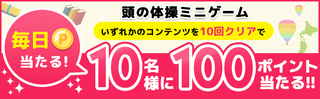 「頭の体操ミニゲーム」内のいずれかのコンテンツを10回プレイ完了した方の中から毎日抽選で10名様に楽天ポイント100ポイントプレゼント!