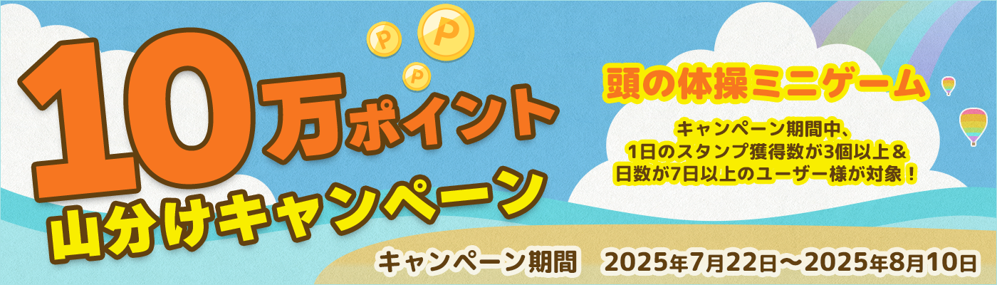 キャンペーン期間中に「頭の体操ミニゲーム」で1日のスタンプ獲得数が3回以上の日数が7日以上のユーザー様で10万ポイントを山分け!
