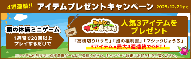 ※付与アイテムは各週「高枝切りバサミ」「畑の権利書」「マジックじょうろ」を1個づつとなります。