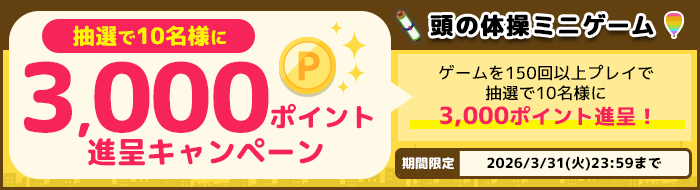 期間中に頭の体操ミニゲームを150回以上プレイ(プレイ=スタンプ獲得)した方の中から、抽選で10名様に楽天ポイント3,000ポイントを進呈いたします。